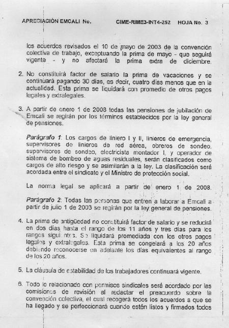 1. Los preacuerdos finales de las comisiones negociadoras de Emcali y SINTRAEMCALI dejaron en firme que las partes ratifican todos los acuerdos revisados el 10 de mayo de 2003 de la convención colectiva de trabajo, exceptuando la prima de mayo - que seguirá vigente - y no afectará la prima extra de diciembre.