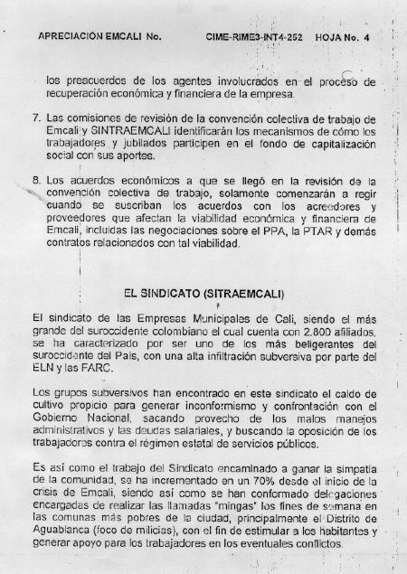 Informe de inteligencia militar sobre la actividad sindical en el marco de las Empresas Municipales de Cali (SINTRAEMCALI).