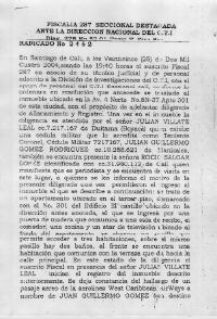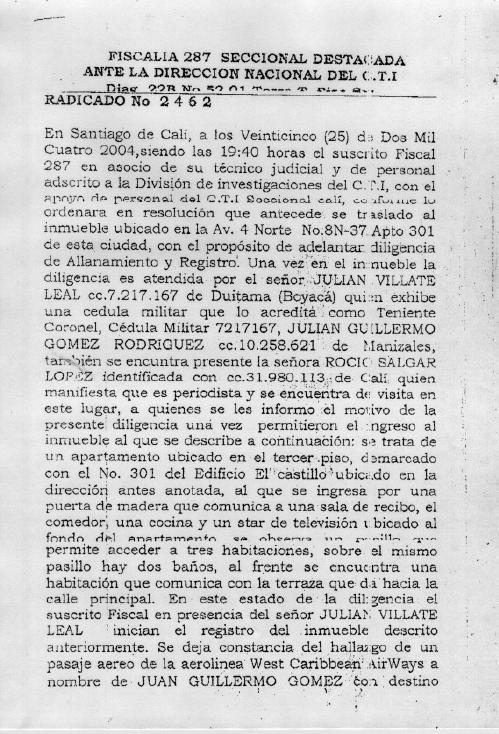 En Santiago de Cali, a los Veinticinco (25) de Dos Mil Cuatro 2004,siendo las 19:40 horas el suscrito Fiscal 287 en asocio de su técnico judicial y de personal adscrito a la División de investigaciones del C.T.I con el apoyo de personal del C.T.I Seccional Cali, conforme lo ordenara en resolución que antecede se traslado al inmueble ubicado en la Av. 4 Norte No.8N-37 Apto 301 de esta ciudad, con el propósito de adelantar diligencia de Allanamiento y Registro. Una vez en el inmueble la diligencia es atendida por el señor JULIÁN VILLATE LEAL cc.7.217.167 de Duitama (Boyacá) quien exhibe una cedula militar que lo acredita como Teniente Coronel, Cédula Militar 7217167, JULIÁN GUILLERMO GÓMEZ RODRÍGUEZ cc.10.258.621 de Manizales, también se encuntra presente la señora ROCÍO SALGAR LOPÉZ identificada con cc.31.980.113 de Cali, quien manifiesta que es periodista y se encuentra de visita en este lugar, a quienes se les informo el motivo de la presente diligencia una vez permitieron el ingreso al inmueble al que se describe a continuación: se trata de un apartamento ubicado en el tercer piso, comarcado con el No. 301 del Edificio El castillo ubicado en la dirección antes anotada, al que se ingresa por una puerta de madera que comunica a una sala de recibo, el comedor, una cocina y un star de televisión ubicado al fondo del apartamento se observa un pasillo que permite acceder a tres habitaciones, sobre el mismo pasillo hay dos baños, al frente se encuentra una habitación que comunica con la terraza que da hacia la calle principal.