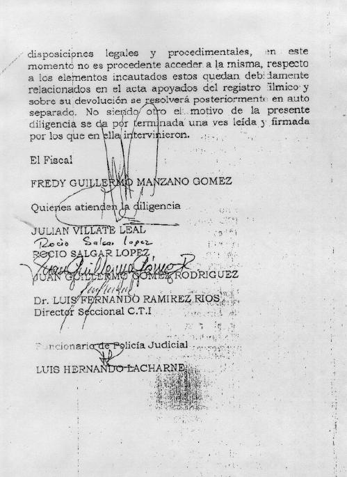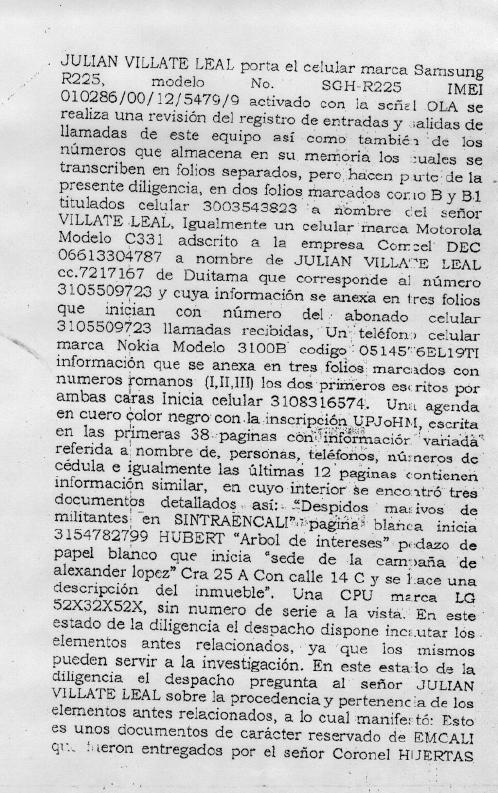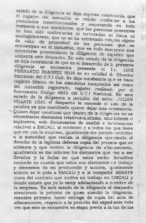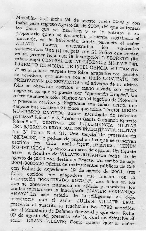 Texto del acta de allanamiento efectuado en Cali en el apartamento ocupado por el Tte. Cnel. Julián Villate Leal, involucrado en las labores de contrainteligencia contra los sindicalistas de SIMTRAEMCALI.