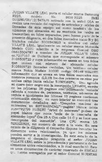 En este estado de la diligencia el despacho le pone de presente al señor JULIÁN VILLATE los folios donde se registraron los números de teléfono que se extractaron de los teléfonos celulares No. 3105509723 y 3003543823 con el propósito de que los revise y se sirva firmar en cada de ellos como constancia de que la información se levanto en el momento mismo de la diligencia.