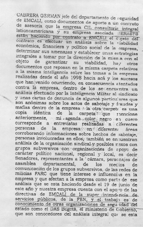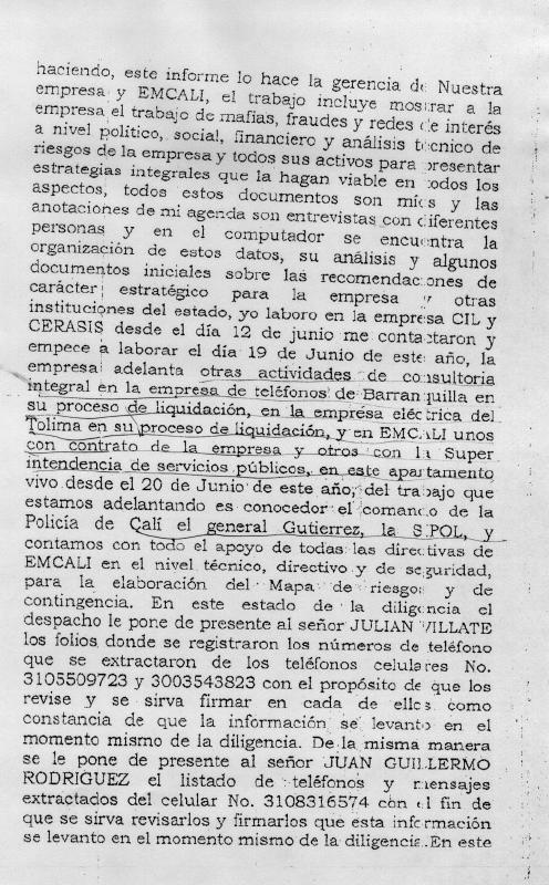 En este esta lo de la diligencia el despacho pregunta al señor JULIÁN VILLATE LEAL sobre la procedencia y pertenencia de los elementos antes relacionados, a lo cual manifestó: Esto es unos documentos de carácter reservado de EMCALI que fueron entregados por el señor Coronel HUERTAS CABRERA GERMÁN jefe del departamento de seguridad de EMCALI, como documentos de aporte a un contrato de asesoria que la empresa CIL consultoria integral lationoamericana y su empresa asociada SERASYS están haciendo por contrato a EMCALI el objeto del contrato es efectuar un análisis sobre la viabilidad económica, financiera y político social de la empresa, determinar sus amenazas y establecer unas estrategias integrales a tomar por la dirección de la misma con el objeto de garantizar su viabilidad, hay otros documentos que reposan en la misma carpeta relativos a la misma inteligencia sobre las tomas a la empresa realizadas desde el año 1998 hacia acá y los sucesos que han venido ocurriendo, en consecuencia atentados contra la empresa, dentro de los se encuentra un análisis efectuado por la Inteligencia Militar al sindicato y unas cartas de denuncia de algunos particulares que son anónimas sobre los actos de sabotaje y fraudes y mafias dentro de la empresa la otra carpeta es una copia idéntica de la carpeta que mencione anteriormente, mi agenda color negro en cuero corresponde a entrevistas realizadas a diferentes personas de la empresa en diferentes áreas corroborando informaciones sobre hechos de sabotaje, personas involucradas en ellos, también se encuentran análisis de la organización sindical y posibles nexos con grupos subversivos con organizaciones de apoyo de carácter político nacional, regional y local, es decir Senadores, representantes a la cámara, personajes de asamblea departamental, de los medios de comunicación de los grupos subversivos, de las redes de milicias FARC que tiene interese e influencias en la empresa y que afectan a la empresa como parte de ese análisis que se esta haciendo desde el 19 de junio de este año y nuestra empresa cuenta con el apoyo de las directivas de EMCALI de la super intendencia de servicios públicos, de la FEN, y el trabajo es de conocimiento de otras organizaciones de seguridad del estado como el DAS Bogotá, el ministerio de Gobierno, que son conocedores del análisis integral que se esta haciendo, este informe lo hace la gerencia de Nuestra empresa y EMCALI, el trabajo incluye mostrar a la empresa el trabajo de mafias, fraudes y redes de interés a nivel político, social, financiero y análisis técnico de riesgos de la empresa y todos sus activos para presentar estrategias integrales que la hagan viable en todos los aspectos, todos estos documentos son míos y las anotaciones de mi agenda son entrevistas con diferentes personas y en el computador se encuentra la organización de estos datos, su análisis y algunos documentos iniciales sobre las recomendaciones de carácter estratégico para la empresa y otras instituciones del estado, yo laboro en la empresa CIL y CERASIS desde el día 12 de junio me contactaron y empece a laborar el día 19 de Junio de este año, la empresa adelanta otras actividades de consultoria integral en la empresa de teléfonos de Barranquilla en su proceso de liquidación, en la empresa eléctrica del Tolima en su proceso de liquidación, y en EMCALI unos con contratos de la empresa y otros con la Super intendencia de servicios públicos, en este apartamento vivo desde el 20 de Junio de este año; del trabajo que estamos adelantando es conocedor el comando de la Policía de Calí el general Gutiérrez, la SPOL, y contamos con todo el apoyo de todas las directivas de EMCALI en el nivel técnico, directivo y de seguridad, para la elaboración del Mapa de riesgos y de contingencia.