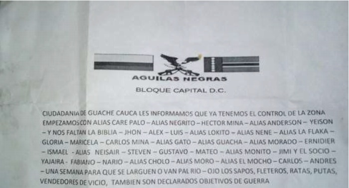 En una zona de amplia presencia militar y policial del Estado Colombiano, se distribuye panfleto suscrito por grupo paramilitar autodenominado "Águilas Negras, que Amenazan de muerte a un grupo de habitantes del municipio, entre ellos al Defensor de Derechos Humanos Gerardo Barona Avirama, a quien le dicen de cariño Nene, integrante de la Red de Derechos Humanos del Suroccidente Colombiano "Francisco Isaías Cifuentes" del comité de derechos humanos del municipio de Caloto, de la Asociación de Trabajadores campesinos pro constitución de zona de reserva campesina del Municipio de Caloto Filial de FENSUAGRO - CUT, del Proceso de Unidad Popular del Suroccidente Colombiano y del Movimiento Político y Social Marcha Patriótica en el Departamento del Cauca.