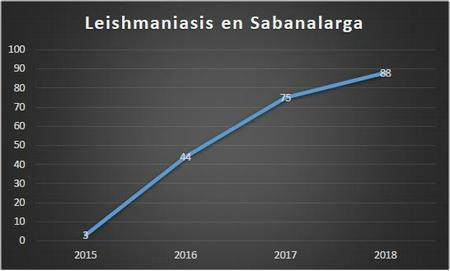 En comparación con el año 2015, cuando se presentaron 3 casos de leishmaniasis en Sabanalarga (en el 2014 se dio 1) la enfermedad se incrementó en 1.466% en 2016; 2 mil 500% en 2017 y casi 3 mil por ciento en 2018, según los registros oficiales de la Secretaría de Salud de Antioquia.
