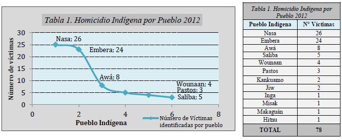 En el período que comprende Enero a Septiembre de 2012, se han presentado 78 homicidios cometidos contra miembros de Pueblos Indígenas. Los cuales son el resultado de asesinatos selectivos, víctimas de MAP/MUSE o combates entre grupos armados legales e ilegales y muerte de menores de edad a causa de desnutrición o falta de atención médica oportuna. Entre los Pueblos Indígenas más afectados en lo corrido del año, se encuentran los pueblos: Nasa (26), Embera (24), Awá (8) de acuerdo con las cifras que se observan a continuación: