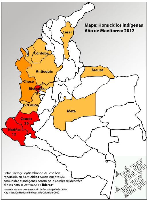 [Fuente: Consejería de Derechos de los Pueblos Indígenas, Humanos, DIH y Paz de la Organización Nacional Indígena de Colombia - ONIC, ene-sep12]