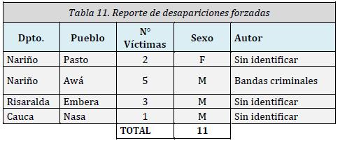 La Consejería de Derechos Humanos de la ONIC en lo corrido de 2012 reporta siete (7) eventos de desaparición forzada ocurridos en Nariño, Cauca y Risaralda; los cuales han afectado de manera crítica al pueblo Awá, ya que de las once (11) víctimas reportadas cuatro (4) pertenecen a este pueblo. Recordemos que el año 2011, de acuerdo con información recopilada por organizaciones regionales indígenas, se reportó la desaparición forzada de por lo menos 5 niños, niñas y adolescentes pertenecientes a los pueblos indígenas Awá y Embera de los departamentos de Nariño y Chocó, respectivamente (Ver Informe-Diagnóstico DDHH y DIH 2011 de la ONIC).