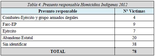 En la tabla 4. En la última década, los datos sobre la responsabilidad de los actores que vienen cometiendo el genocidio sobre los pueblos indígenas se han elevado. Se evidencia que el presunto responsable de los hechos que atentaron contra la vida de miembros y líderes indígenas, en la mayoría de los casos no se pudo determinar el móvil ni la autoría debido a la manera como se dieron los sucesos. Por otro lado, los casos de víctimas de minas-antipersonales acusan como responsable al grupo armado ilegal Farc-EP. Las muertes de menores de edad a causa de cuadros de desnutrición o enfermedades como diarrea aguda, fiebres o infecciones respiratorias se identifican como responsable al Estado, que como principal garante de los derechos de sus ciudadanos, no ha tomado las medidas necesarias para prevenir estos casos .