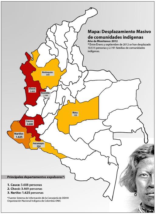 La cifra de desplazamiento ha aumentado en comparación a anteriores años. Si comparamos en el año 2011, se constata que desde enero a diciembre anterior se registraron en el Sistema de Información de la ONIC un desplazamiento masivo de 5.100 personas pertenecientes a comunidades indígenas, suma que este año 2012, a septiembre ha sido casi doblada. En esta dinámica se destaca que los desplazamientos se concentran en casi los mismos departamentos que en el año 2011, lo cual constata que no se han tomado, por parte del Gobierno, las medidas necesarias para poder evitar dichos desplazamientos. Para este año, en el departamento del Cauca la cifra es alarmante, seguida por la del Chocó, Nariño, Risaralda, Antioquia, Meta y Putumayo.