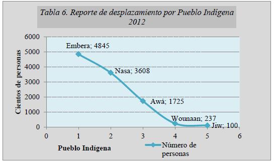 Los pueblos indígenas afectados de manera desproporcionada en lo corrido del año por el desplazamiento forzado son: Embera (4.845); Nasa (3.608); Awá (1.725); Wounaan (237) y Jiw (100) tal como lo evidencia la Tabla 6. Reporte de desplazamiento por Pueblo: