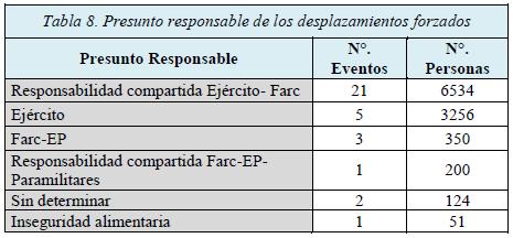 Sobre las causas que produjeron los desplazamientos masivos de comunidades indígenas se pudo establecer que 20 eventos de los 32 reportados dejaron 6.154 indígenas desplazados fueron originados por confrontaciones armadas en territorio indígena entre miembros del Ejército y grupos armados ilegales. A continuación, la relación de los eventos con los presuntos responsables: