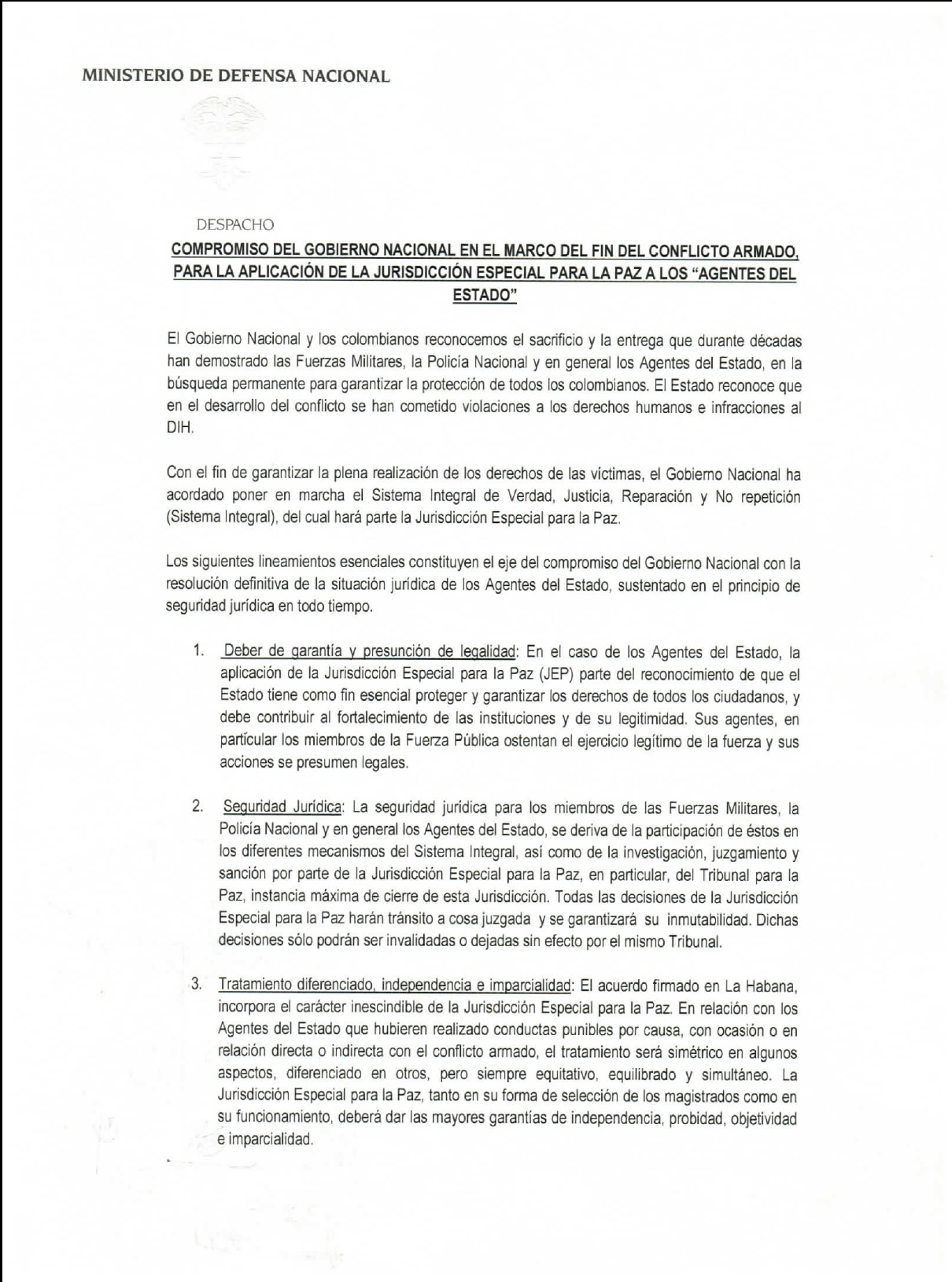 Compromiso del Gobierno Nacional para la aplicación de la JEP a los agentes del estado