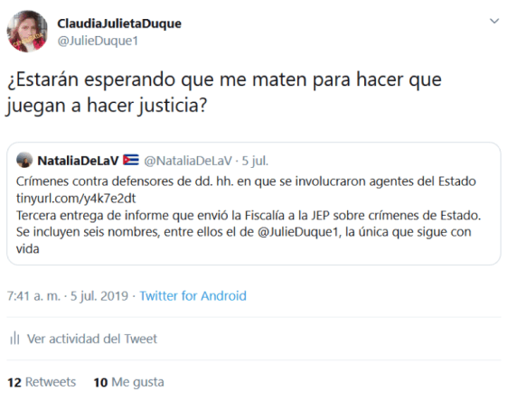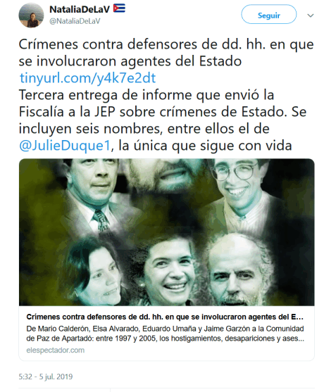 9. El 5 de julio de 2019, a través de Twitter, la periodista republicó un trino hecho desde la cuenta @NatalieDeLaV en el que se hacía alusión a un artículo en el que ella era mencionada como la única sobreviviente de los más graves crímenes contra los derechos humanos perpetrados por agentes del Estado entre 1997 y 2005. Ello con base en una serie de tres reportajes publicados por El Espectador, el último de ellos desde la medianoche del día anterior (4 julio), titulado 'Crímenes contra defensores de dd. hh. en se involucraron agentes del Estado (III)'. Los dos trinos son los siguientes: