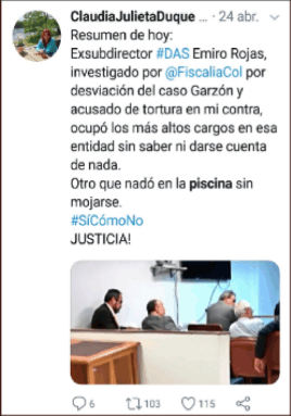 4. El 24 de abril, tras concluir las actuaciones judiciales del día en el proceso contra Rojas y Pachón, en el que Claudia Julieta Duque ha sido reconocida como víctima y cuenta con abogado de parte civil, la periodista publicó en su cuenta de Twitter el siguiente trino: