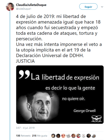 2) Respecto de las publicaciones hechas por El Espectador sobre el proceso en cuestión y la mención a Claudia Julieta Duque como la única sobreviviente de los crímenes de Estado cometidos entre 1997 y 2005 en Colombia, realizadas los días tres 27 de febrero y 5 de julio de 2019 respectivamente, éstas no incluyen pronunciamiento alguno hecho de mi apoderada, salvo por las citas a la entrevista mencionada previamente, y un tuit en el que Claudia Julieta, el mismo 3 de julio, se reafirma por lo dicho con anterioridad. por lo cual es absurdo que se le impongan sanciones por hechos en los que la víctima no participó.