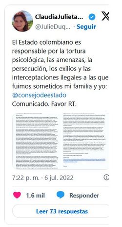 el 20nov23 a favor de Claudia Julieta Duque"Esta sentencia me conmociona de una forma profunda, es una reivindicación muy importante de mi verdad, es ahora la verdad judicial contra otro sindicado, quizá el autor material más importante en la ejecución de la tortura. Esta sentencia es reparadora profundamente y pone fin a la revictimización que he sufrido en el marco del proceso judicial en el caso de Ronal Rivera, aunque hay otros casos abiertos en los que sigo sometida a burlas y a muchos maltratos", le dijo Claudia Julieta Duque a Cuestión Pública.