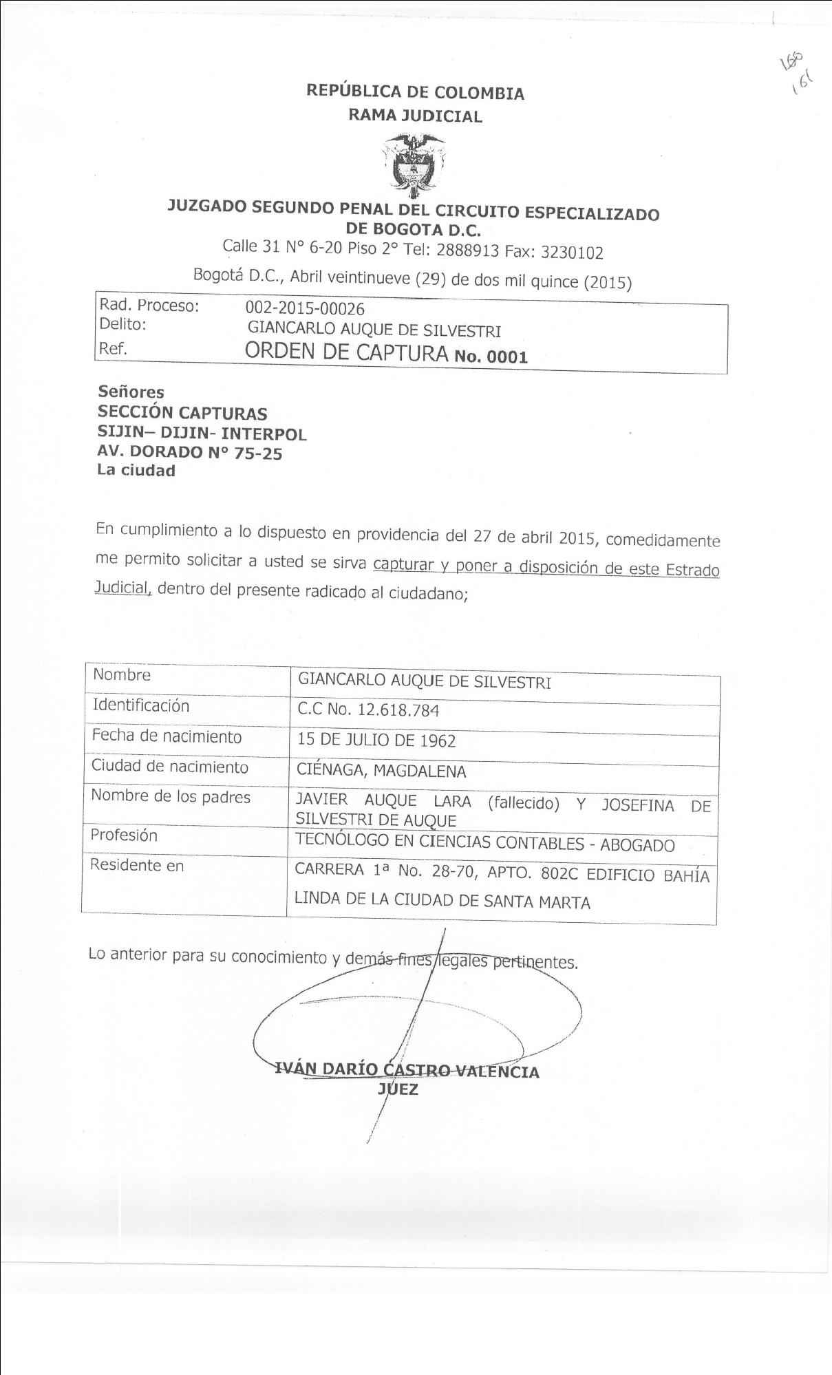 b) Así mismo mediante correo electrónico exchange de fecha 10/09/2015 fue enviada solicitud al Jefe de la Seccional de Investigación Criminal de la Policía Metropolitana de Santa Marta, con el fin de que funcionarios de Policía Judicial adscritos a esa Seccional, realizaran las labores tendientes a hacer efectiva la orden de captura del señor Giancarlo Auqué De Silvestri identificado con Cédula de Ciudadanía No. 12618784, teniendo en cuenta que según lo establecido en la orden de captura, el antes mencionado reside en la carrera 1ª No. 28-70, APTO. 802C edificio Bahía Linda de la ciudad de Santa Marta.