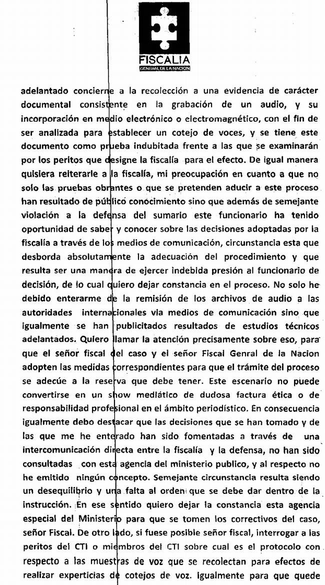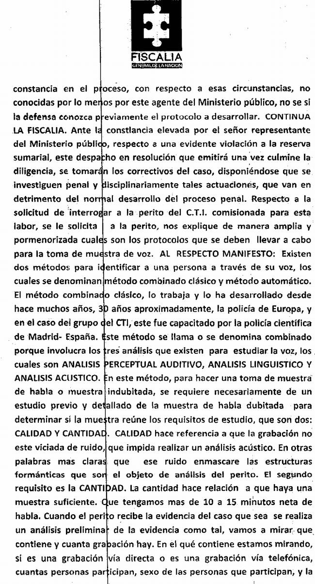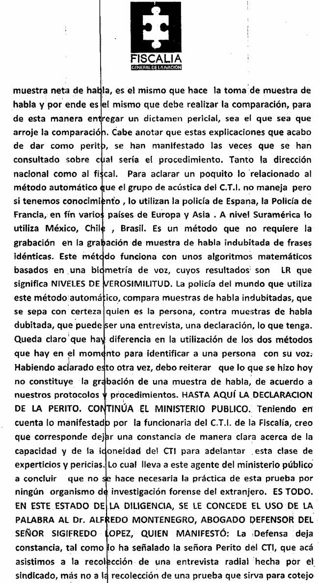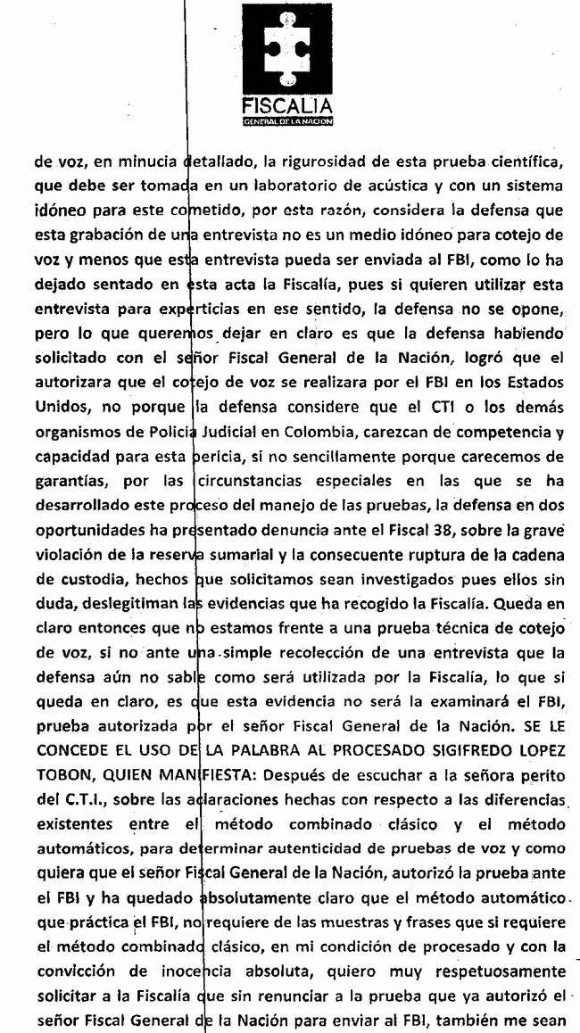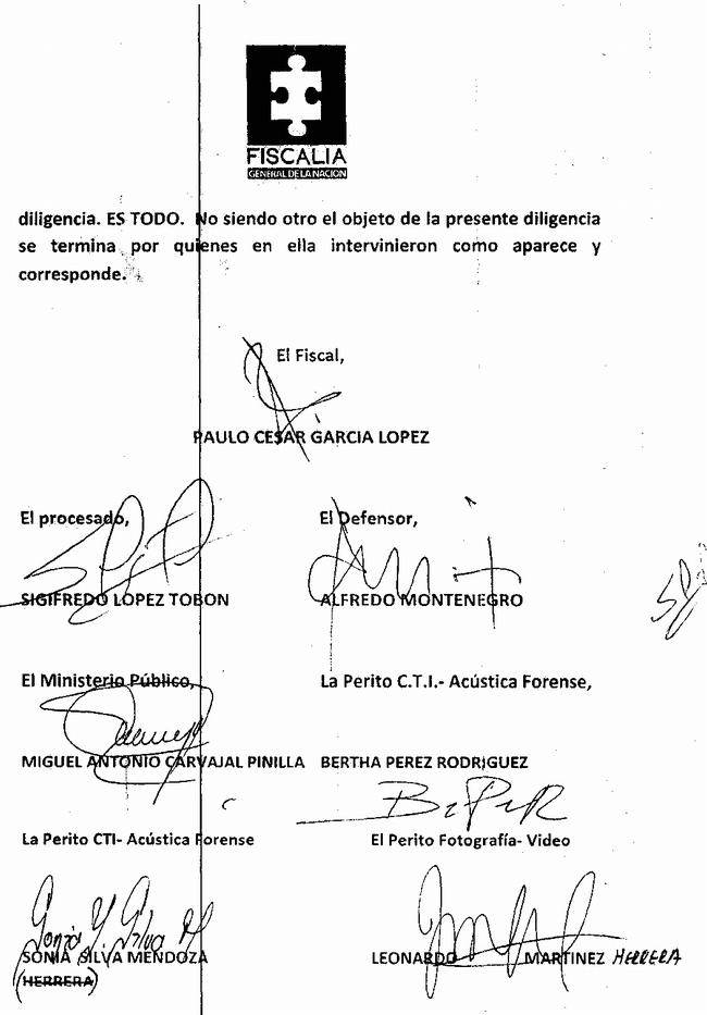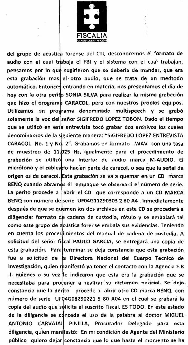 Acta de recolección de muestra de voz de Sigifredo López Tobón con fines de entrega a las autoridades estadounidenses