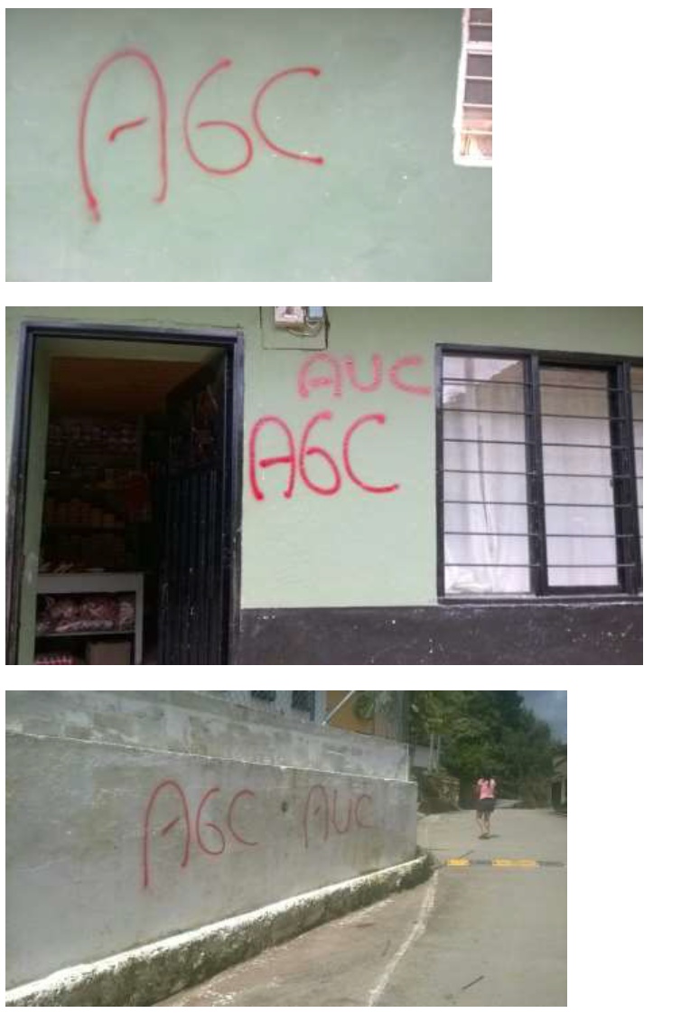 En el Corregimiento Santa Rita, y en la Vereda el Palmar se registra la aparición de "grafitis" en las fachadas de las viviendas y en algunos muros de contención, alusivas al grupo paramilitar autodenominado "Autodefensas Gaitanistas de Colombia" con los siguientes mensajes (fotos):
