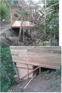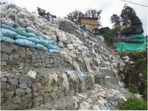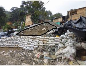 Foto 7: Otro tipo de sistema empleado, en esta caso no hay gaviones sino costales con tierra como contención, en la corona parece haber fallado anteriormente, se indica la misma