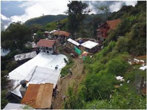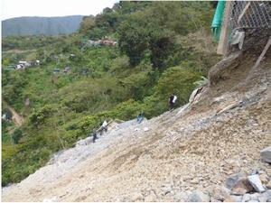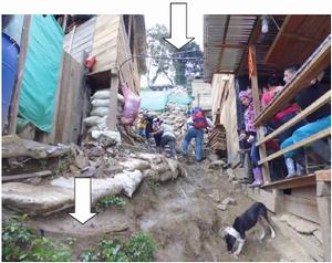 En la visita se observó que el sector San Roman, sitio donde ocurrió el evento, se caracteriza por una deforestación total de la superficie favoreciendo el aumento de la escorrentía superficial que luego repercute en la activación de procesos erosivos que van desde laminares hasta profundos con potencialidad de producir movimientos en masa especialmente en las laderas de mayor pendiente. Sobre esta superficie se construyen viviendas en su mayoría ranchos en madera, sin el cumplimiento de condiciones de acuerdo a la norma sismo-resistente NSR10 en cuanto a la eventualidad ocurrencia de un evento sísmico, sumamente probable por la cercanía a fallas tales como Romeral y Sabanalarga a nivel regional y específicamente en el área la falla Tonusco, con una población en riesgo de 3000 personas, con algunas viviendas prefabricadas, sobre una ladera de alta pendiente, con la presencia de depósitos coluviales conformados por materiales heterogéneos en algunos puntos, pero en general se aprecia en los taludes la roca andesitica con buenas características desde el punto de vista de estabilidad, sin embargo, con una altísima pendiente.