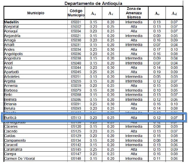 4. Al consultar la zona en la norma NSR 10, norma sismoresistente en el apéndice A4.VALORES DE Aa, Av, Ae Y Ad Y DEFINICION DE LA ZONA DE AMENAZA SÍSMICA DE LOS MUNICIPIOS COLOMBIANOS se encuentra para el caso del departamento de Antioquia: