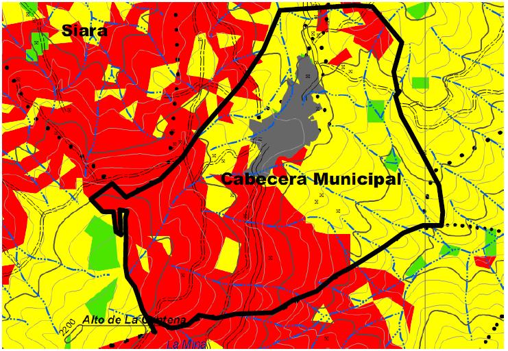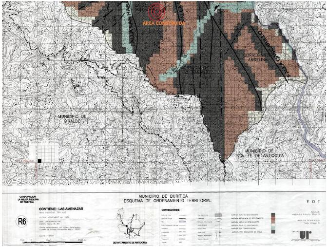 Cabecera Urbana: Se delimita todo el perímetro que se debe intervenir alrededor de la cabecera urbana donde se incluye el sector la Planta, donde se tiene la invasión en zona de alta pendiente. Donde habitan más de veinte familias en condiciones de riesgo y además se tiene un alto riesgo de contaminación de la fuente de abastecimiento de agua de la cabecera municipal. Esto está sustentado en informe del Muncipio de Buriticá, anexo al presente.