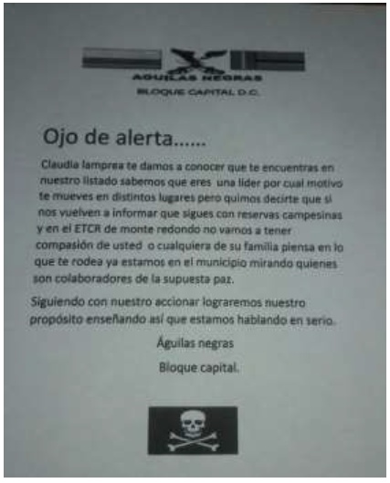 Centro poblado, aproximadamente a las 6:00 de la mañana, cuando Claudia Adiela Lamprea Taborda, se disponía a iniciar sus labores cotidianas observa que por debajo de la puerta le fue lanzado un panfleto con el siguiente contenido: