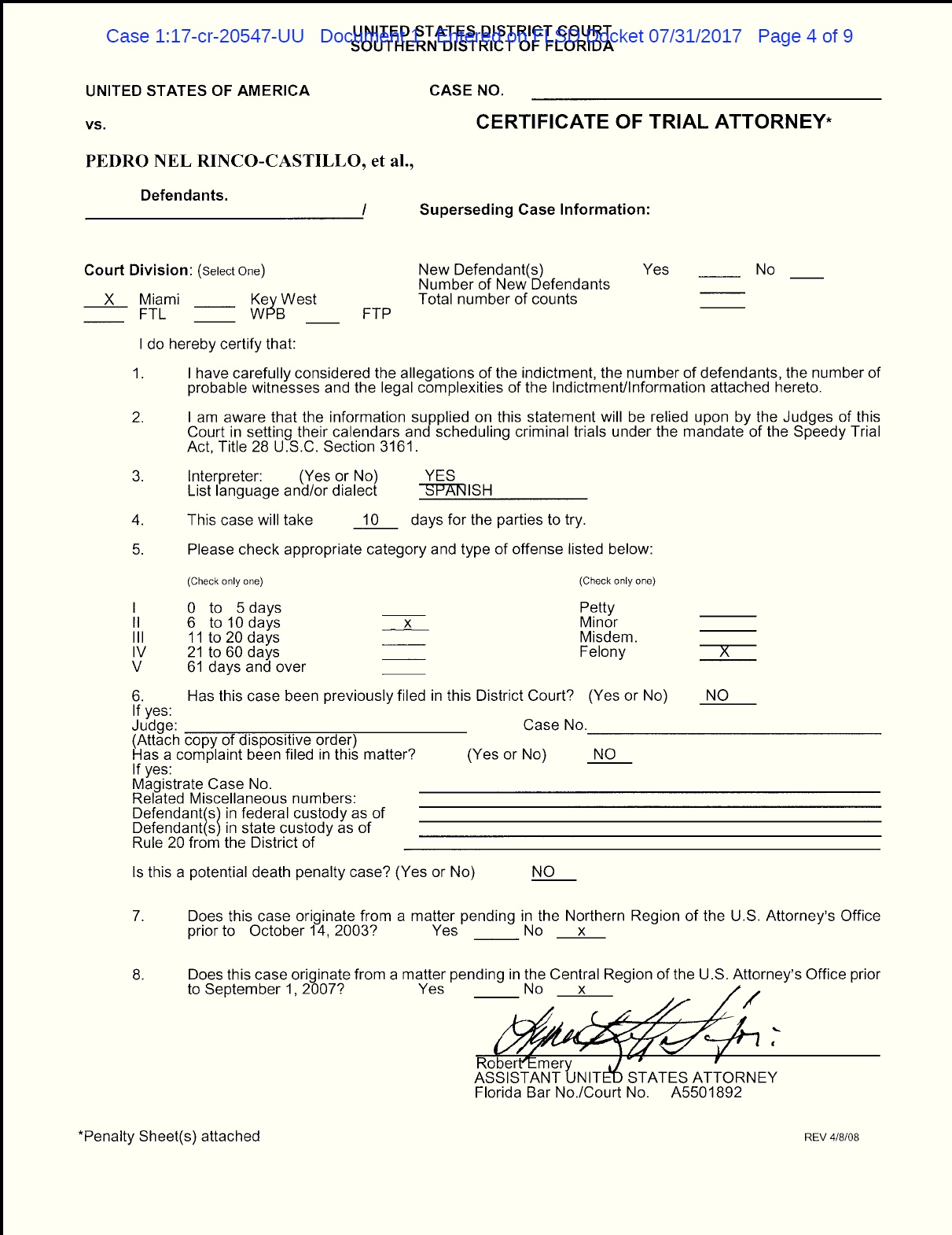 Text of the indictment charging Pedro Nel Rincón Castillo