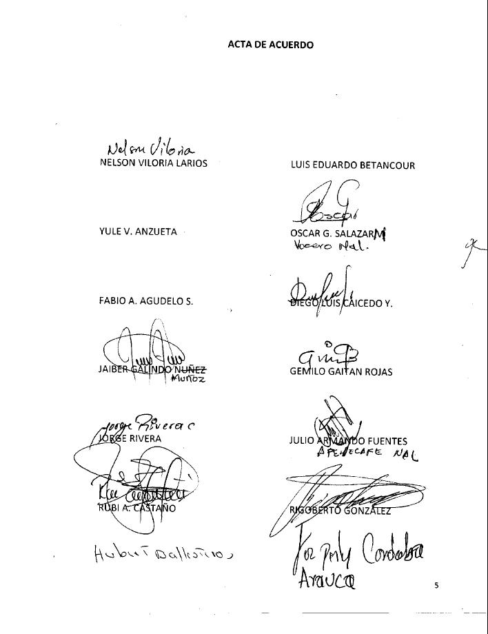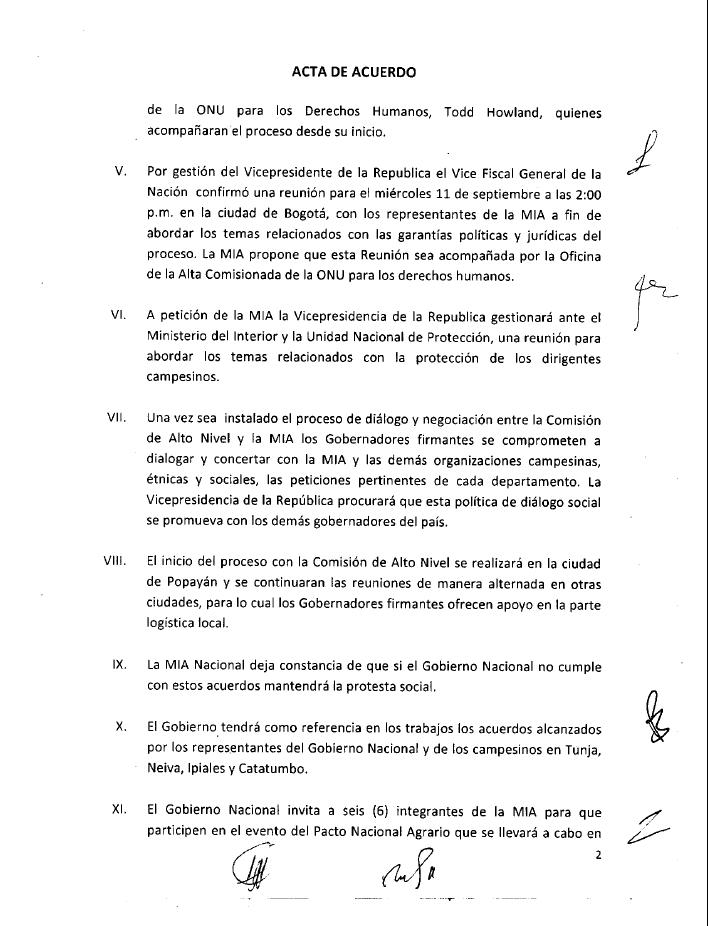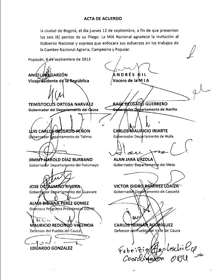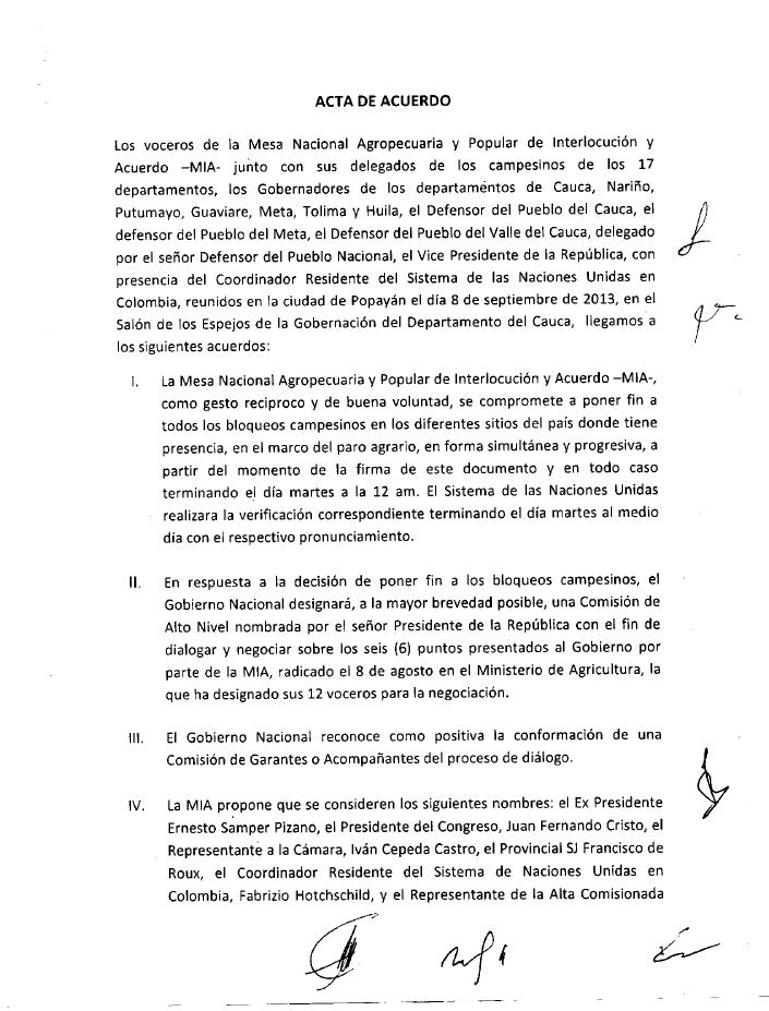 ACTA DE ACUERDO Los voceros de la Mesa Nacional Agropecuaria y Popular de Interlocución y Acuerdo -MIA- junto con sus delegados de los campesinos de los 17 departamentos, los Gobernadores de los departamentos de Cauca, Nariño, Putumayo, Guaviare, Meta, Tolima y Huila, el Defensor del Pueblo del Cauca, el defensor del Pueblo del Meta, el Defensor del Pueblo del Valle del Cauca, delegado por el señor Defensor del Pueblo Nacional, el Vice Presidente de la República, con presencia del Coordinador Residente del Sistema de las Naciones Unidas en Colombia, reunidos en la ciudad de Popayán el día 8 de septiembre de 2013, en el Salón de los Espejos de la Gobernación del Departamento del Cauca, llegamos a los siguientes acuerdos: