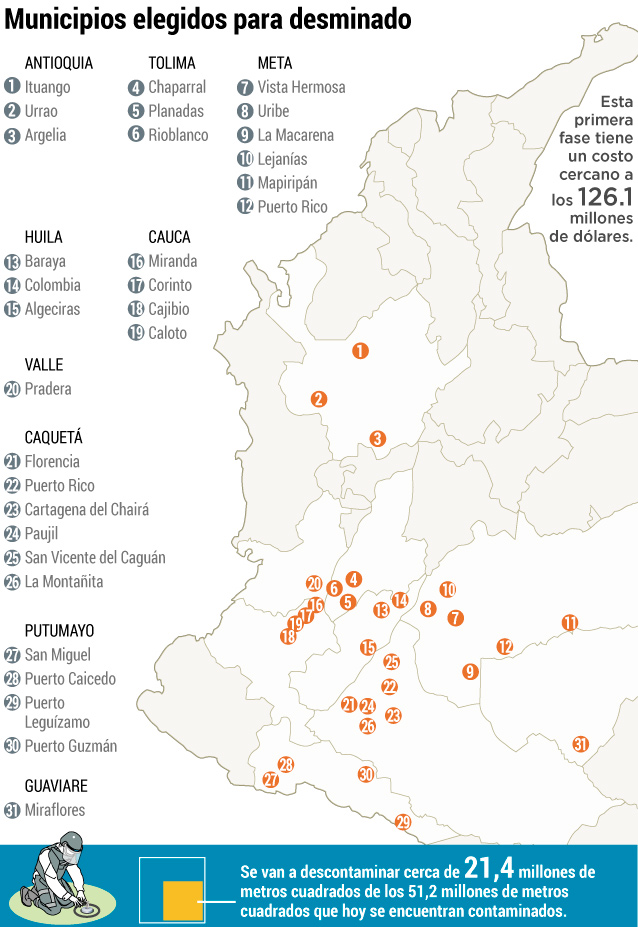 La meta es que al finalizar el año se haya logrado la intervención de por los menos 276 de los 673 municipios con algún tipo de contaminación por estos artefactos, es decir, por lo menos el 41 %. "Adicionalmente, hay 31 municipios asignados para realizar estudios no técnicos y 183 municipios considerados de baja afectación, de los cuales vamos a recibir actas de los consejos de seguridad donde nos certifican que en sus territorios no se encuentra evidencia de sospecha de artefactos", sostuvo Rafael Pardo al señalar que para la puesta en marcha de la primera fase se requerirá una inversión cercana a los US$126 millones ($360.000 millones), es decir, el 38,5 % del valor total del Plan Estratégico 2016-2021, estimado en US$327,9 millones.