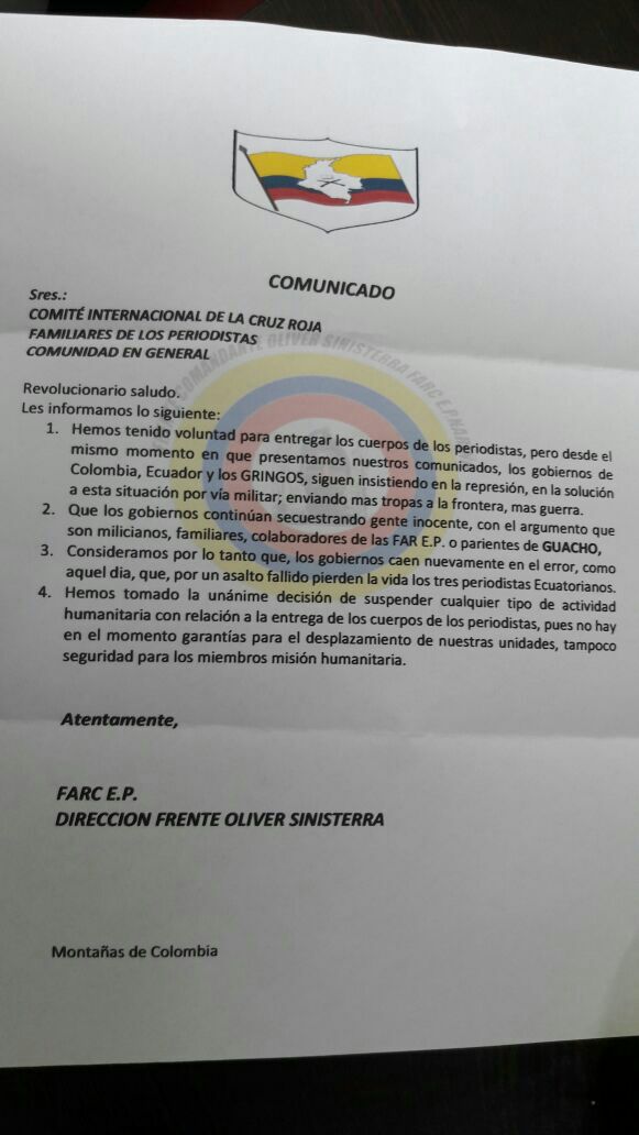 1. Hemos tenido voluntad para entregar los cuerpos de los periodistas, pero desde el mismo momento en que presentamos nuestros comunicados, los gobiernos de Colombia, Ecuador y los GRINGOS, siguen insistiendo en la represión, en la solución a esta situación por vía militar; enviando mas tropas a la frontera, mas guerra.