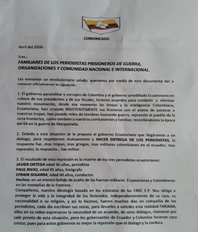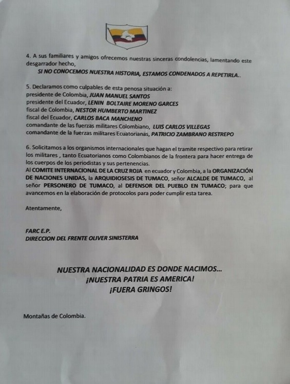1. El gobierno paramilitar y corrupto de Colombia y el gobierno arrodillado Ecuatoriano en cabeza de sus presidentes y de sus fiscales, hicieron acuerdos para combatir y eliminar nuestro movimiento, desde ese momento las tropas y la inteligencia Colombiana, Ecuatoriana, han cruzado INSISTINTEMENTE sus fronteras con el animo de asesinar a nuestras tropas, han pasado miles de hombres buscando guerra, represión al pueblo de la zona fronteriza, como también a nuestros combatientes y familias, recordándonos la época del 64 en La guerra de Marquetalia.