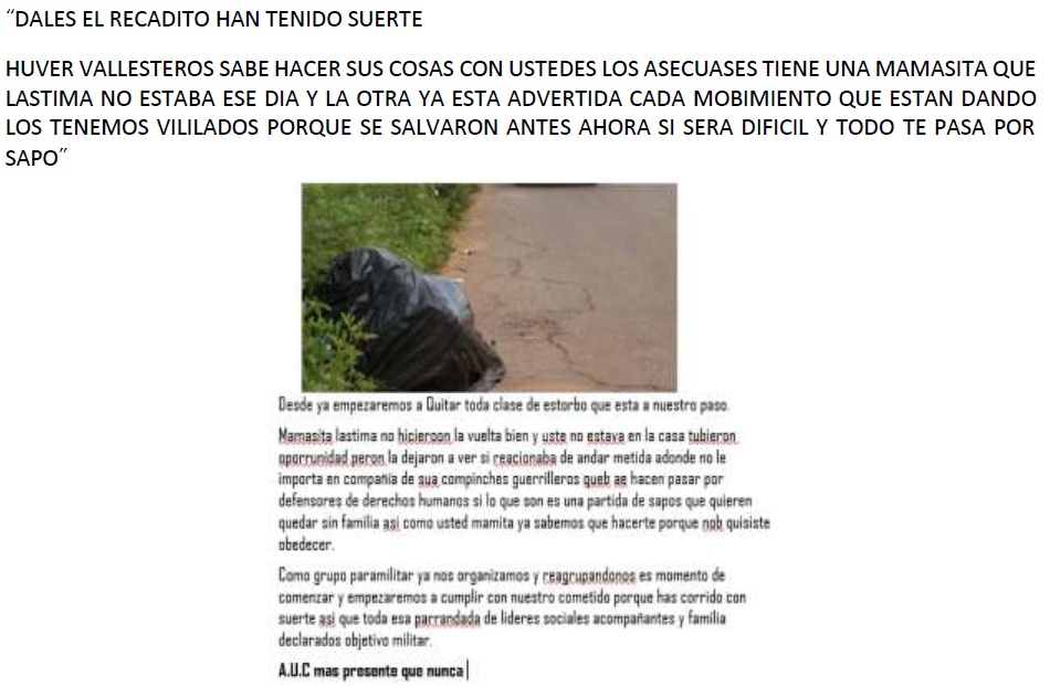 Señalamientos, amenazas de muerte e intimidación en contra de Defensora de Derechos Humanos y directiva de la Corporación de Derechos Humanos "Francisco Isaías Cifuentes" Mayerli Hurtado Motta y de Defensor de Derechos Humanos y dirigente sindical, social y político Huber de Jesús Ballesteros Gómez, ambos integrantes del Movimiento Político y Social Marcha Patriótica y Miguel Ángel Muñoz hombre de protección contratista de la Unidad Nacional de Protección.