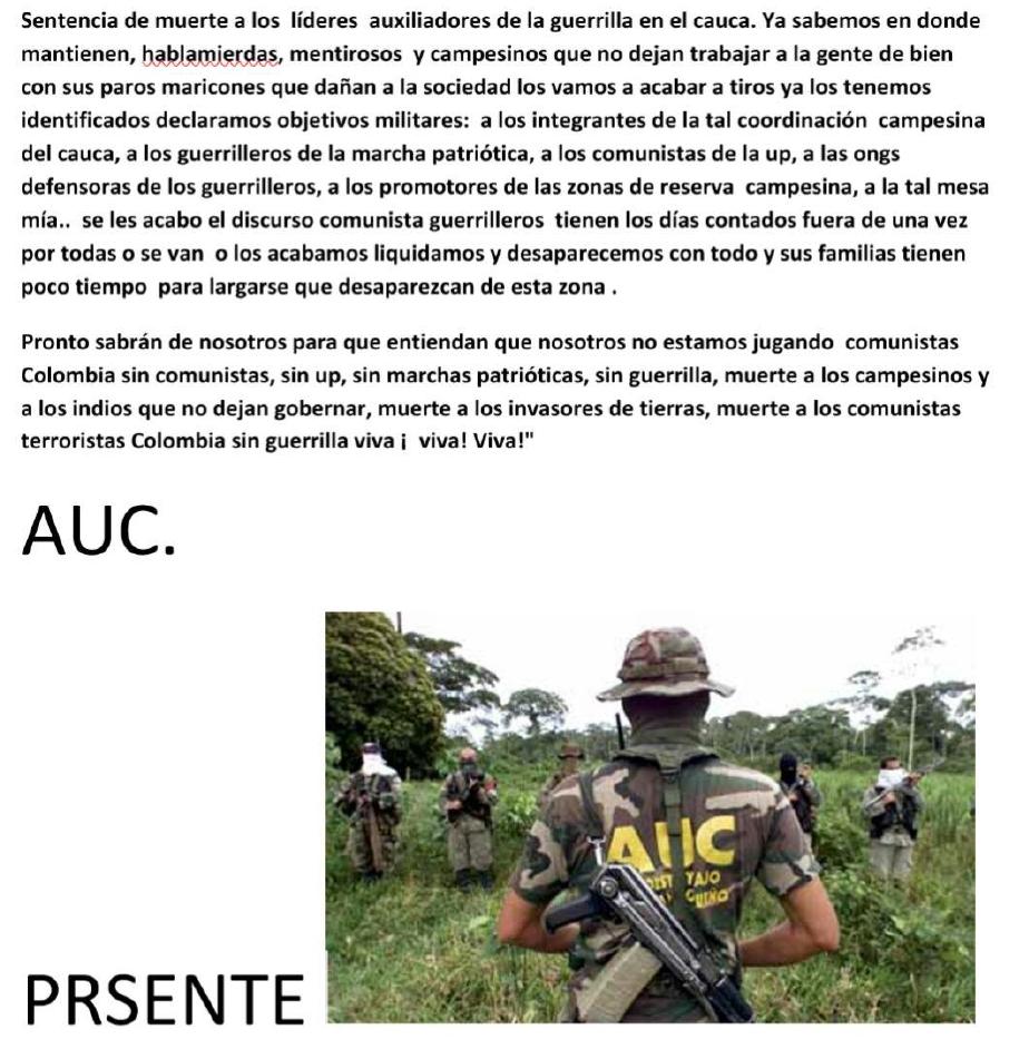 Señalamientos y amenazas de muerte del grupo Paramilitar Autodenominado "AUC" en contra de líderes y Defensores de Derechos Humanos de la Coordinación Campesina, el Movimiento Político y Social Marcha Patriótica, la Unión Patriótica y la Mesa Agraria y Popular de Interlocución y Acuerdos MIA en el Departamento del Cauca.