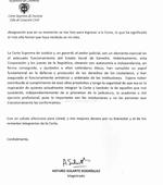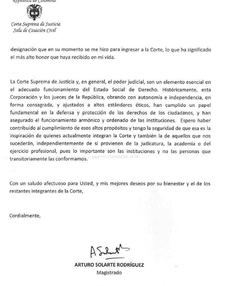 Carta de renuncia de Arturo Solarte a su cargo de Magistrado de la Corte Suprema