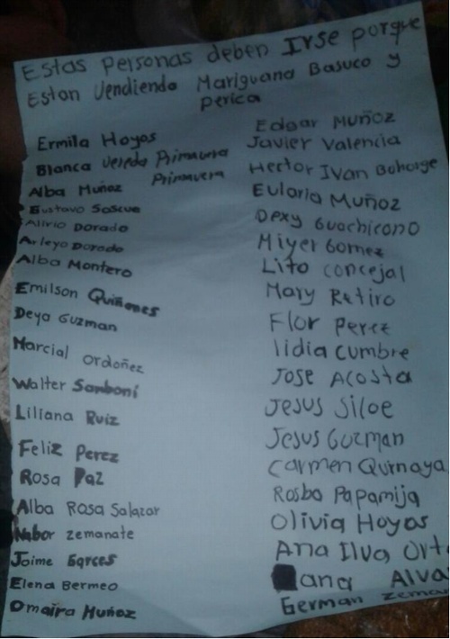 En la cartelera aparecen los nombres de habitantes del Municipio de Sucre quienes pese a ser señaladas de ser expendedoras de droga, son campesinos humildes y amas de casa dedicadas al hogar.