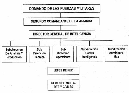 En cada unidad militar existe una agencia de inteligencia, la cual envía sus Informaciones a la Dirección Nacional de Inteligencia -DINTE. La información clasificada y codificada es remitida a las Comandancias Generales del Ejército, la Policía y la Armada, entes que se reúnen en el Comando General de las Fuerzas Armadas. Entre las diferentes armas existe coordinación e intercambio de información. Para los casos objeto de la presente obra, tal coordinación se presentaba entre el Batallón Nueva Granada y la Red 07 de la Armada.