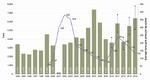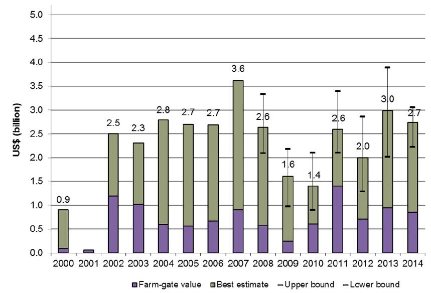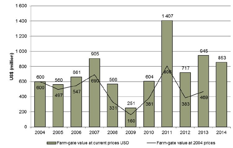 Figure 6: Nominal (current price) farm-gate value in US dollars (millions: bars), together with the farm-gate value adjusted for inflation (constant price adjusted to 2004 price: line) in US dollars, 2004 to 2013