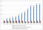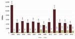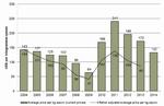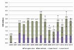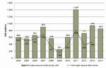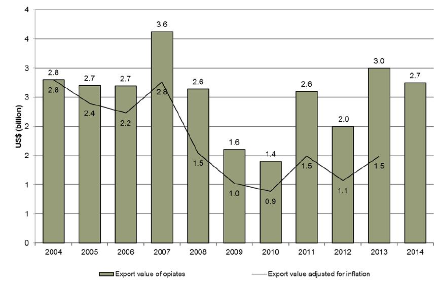 Figure 9: Nominal gross export value of opiates (US dollars: bars), together with the gross export value of opiates adjusted for inflation (US dollars: line), 2004 to 2014