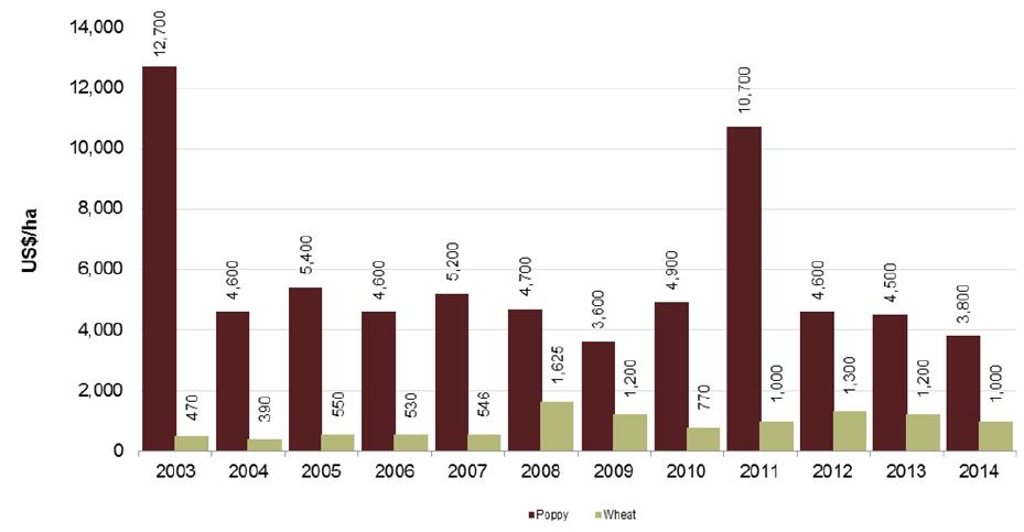 Figure 10: Gross income per hectare from opium and wheat, 2003-2014 (US dollars per hectare)