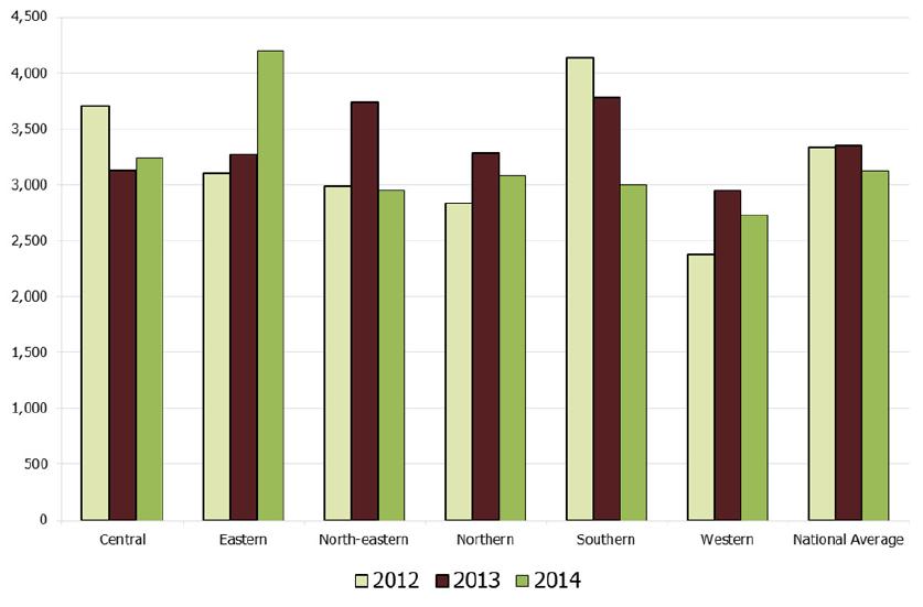 Table 7: Average annual income of all farmers, by region, 2011 to 2013 (reported in 2012, 2013 and 2014)