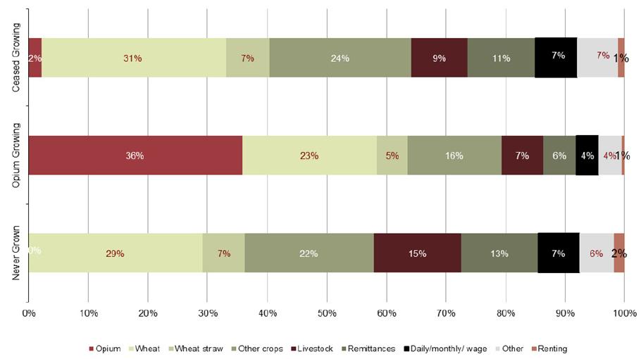 19. The survey relies on reported income, which is difficult to measure. While the absolute income figures reported may not always be reliable or complete, the proportions of different income sources are thought to be reliable enough to understand their relative importance and general differences between opium-growing and non-growing households at an aggregated level. Income in this context refers to the value of all products produced or cash income received in the previous 12 months, including products used for own consumption, such as wheat. [Back]