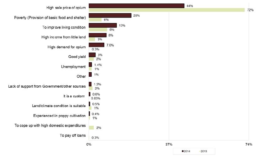 - The reasons why Afghan farmers cultivate opium are multiple. Some of these reasons are declared by farmers when questioned during the village survey, while the (undeclared) underlying reasons are gleaned from an in-depth risk assessment of opium poppy cultivation in Afghanistan, which resulted in the production of risk maps. The lucrative nature of the crop is the principal reason that the largest share of farmers offer as an explanation for their decision to cultivate opium poppy, but a much smaller proportion of opium farmers (44%) actually did so in 2014 than in 2013 (72%).