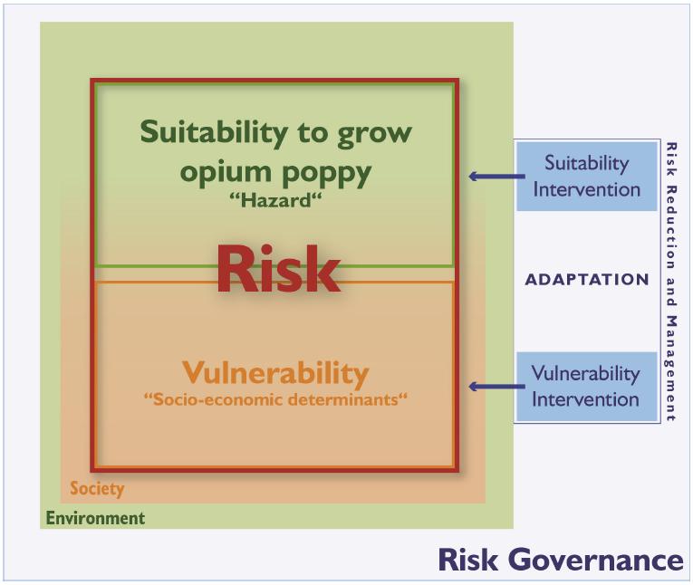 Figure 18: Conceptual framework defining the risk of opium poppy cultivation: risk is composed of environmental and climatic suitability, and vulnerability to illicit cultivation determined by socio-economic factors derived from the UNODC/MCN village surveys and ancillary data