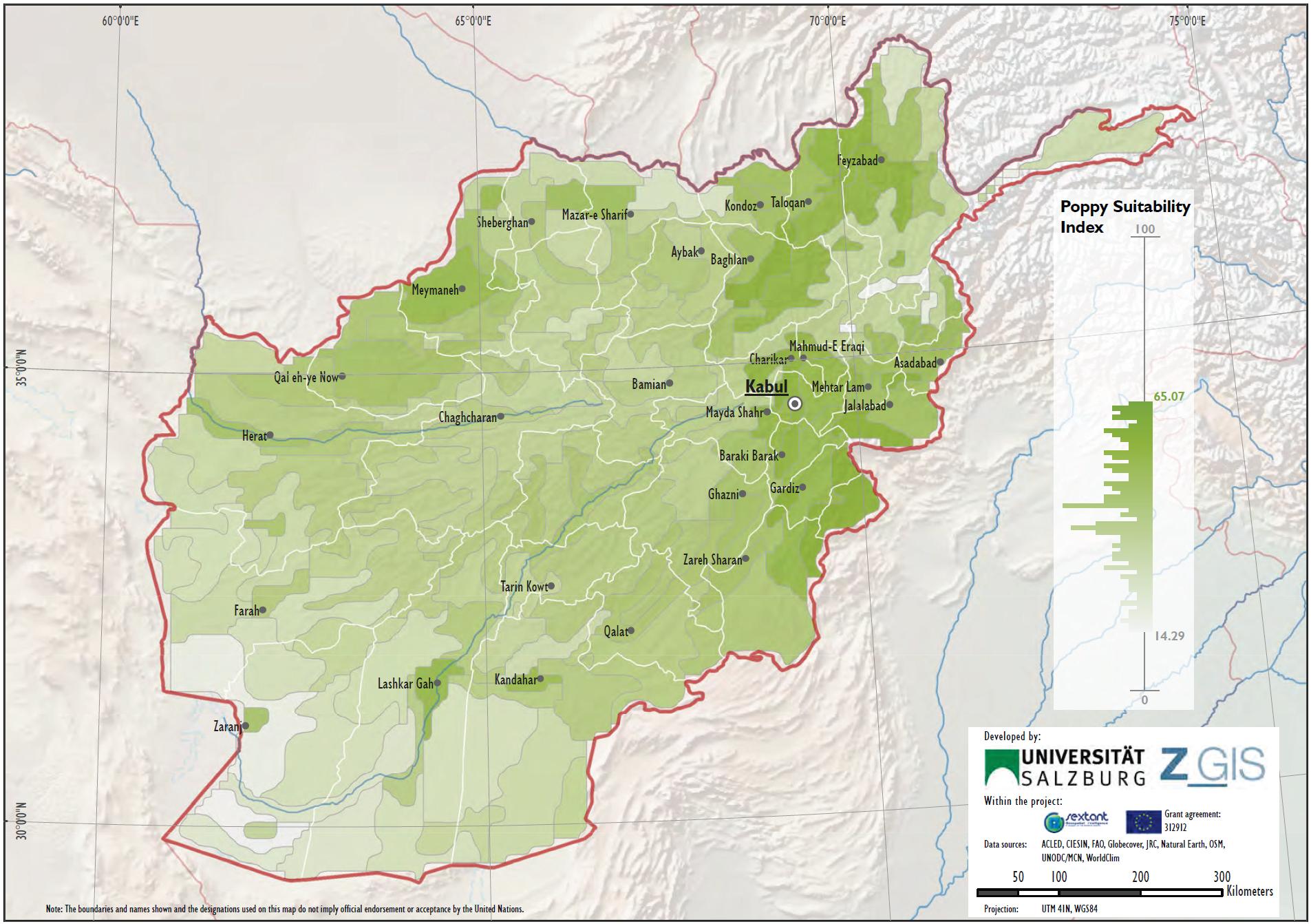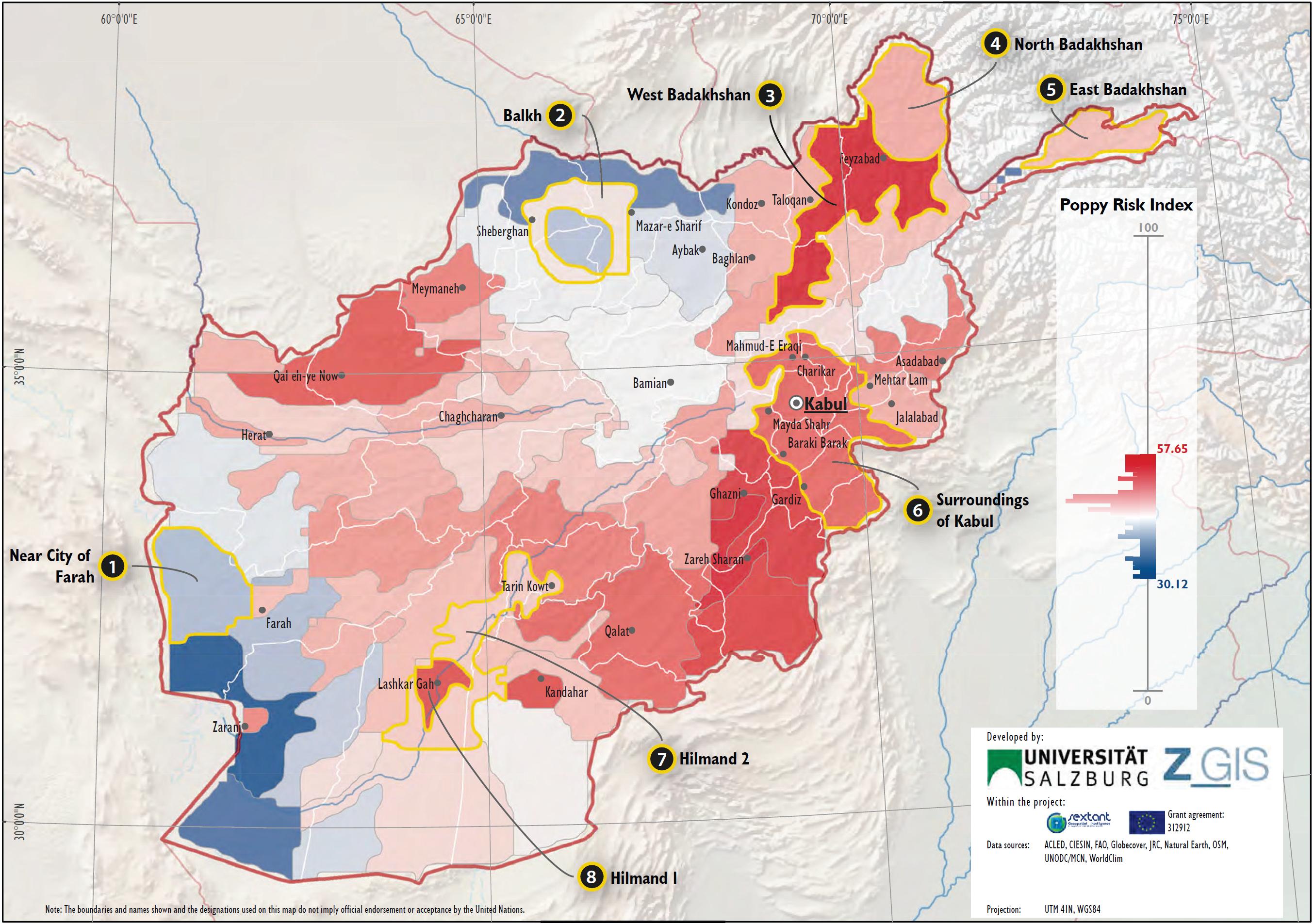 The work was conducted within G-SEXTANT (Service Provision of Geospatial Intelligence in EU External Actions Support), a project of the European Earth Observation (EO) programme Copernicus (previously known as GMES - Global Monitoring for Environment and Security), which combines the use of satellite images with in-situ data to deliver geospatial information services and products to a wide range of end-users. G-SEXTANT addresses specific scenarios in the context of support to EU External Action. In the context of one of the scenarios (illicit crops) the Department of Geoinformatics - Z_GIS (University of Salzburg, Austria) is supporting UNODC in developing a risk assessment approach for illicit crops (such as poppy) by integrating different key spatial indicators which determine poppy cultivation.