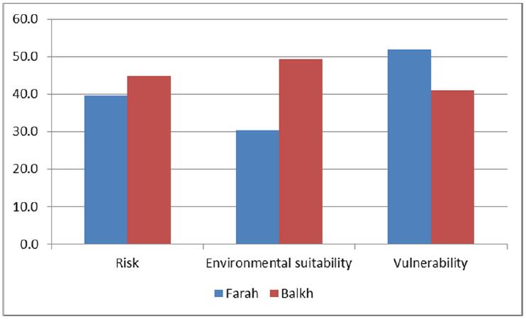 Figure 19: Risk, socio-economic vulnerability and environmental suitability in selected areas of Farah and Balkh