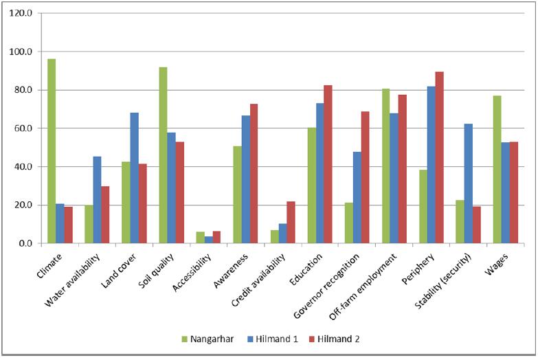 Mansfield (2008, p. 4) asserts that proximity to the provincial capital provides "better access to commodity markets for the purchase and sale of agricultural and non-agricultural goods, as well as labour markets for daily wage labour opportunities and perhaps salaried employment. Those areas nearest the provincial centre may have better physical security and are more likely to benefit from better social and physical infrastructure, as well as, in the case of Nangarhar, a more diverse population in terms of tribes and ethnic groups, making it easier for the provincial authorities to impose their will. These insights mean that areas closer to major settlements are likely to be less vulnerable than peripheral regions. The "peripheral regions" indicator (V3) is closely linked to the accessibility to off-farm employment opportunities, a factor which is represented by both the "lack of accessibility" (V4) and the "lack of alternatives" (V5) indicators. Although all three indicators are intrinsically tied, each relies on independent and very different data sources, thus legitimizing their inclusion.