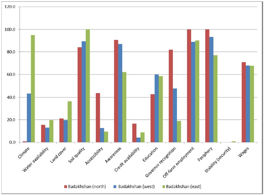 Figure 22: Decomposition of environmental suitability and socio-economic vulnerability in selected areas in Badakhshan*