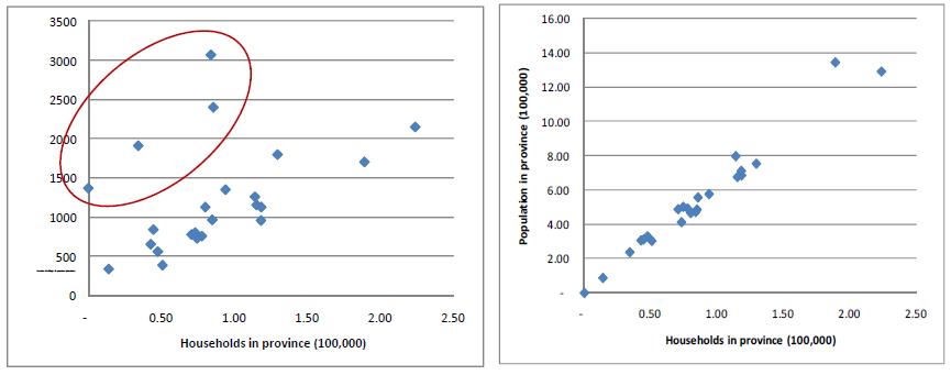 Figure 23: Scatter plots of household data, village data and population data of the village frame